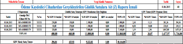 Gün sonunda her bir yazar kasadan alınan Z raporu, muhasebe kaydında belge tipi "diğer" ve belge açıklaması "Z Raporu" olarak kayda alınmalıdır. Ayrıca Z Raporu'nun numarası ve tarihinin de girilmesi gerekmektedir. Ancak gün içinde yapılan satışlara istinaden alınan Z Raporu'nun, ödeme yöntemlerine (nakit, kredi kartı, vb.) göre ayrıştırılması gerekmektedir. Ödeme yöntemine isabet edecek KDV tutarlarının da ayrıştırılarak her bir ödeme yönteminin farklı yevmiye maddelerinde gösterilmesi gerekmektedir.