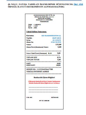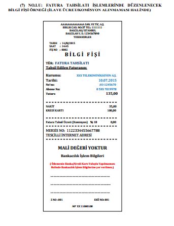Fatura Tahsilatı bilgi fişlerinde tahsil edilen faturanın; kurumu, tarihi, numarası, abone numarası, tutarı ve varsa alınan ücret (komisyon) tutarının,